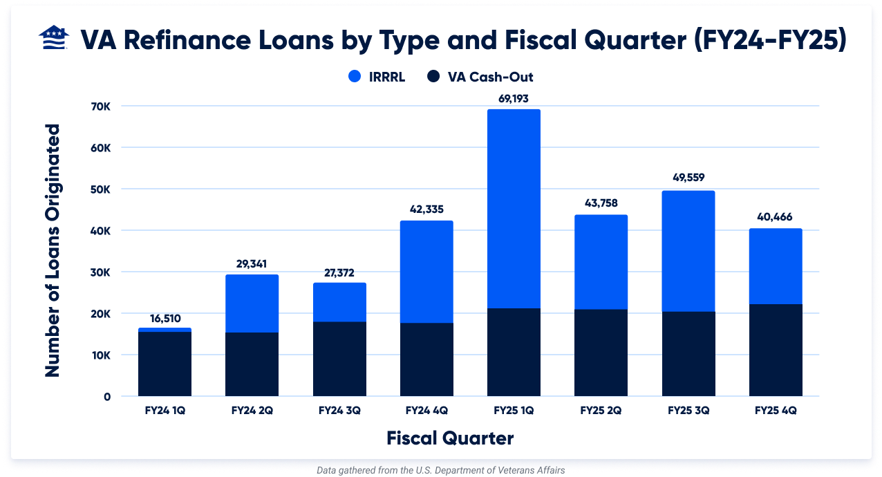 The chart below shows how Veterans have chosen between VA Streamline (IRRRL) and VA Cash-Out refinances over the 2024 and 2025 fiscal years.